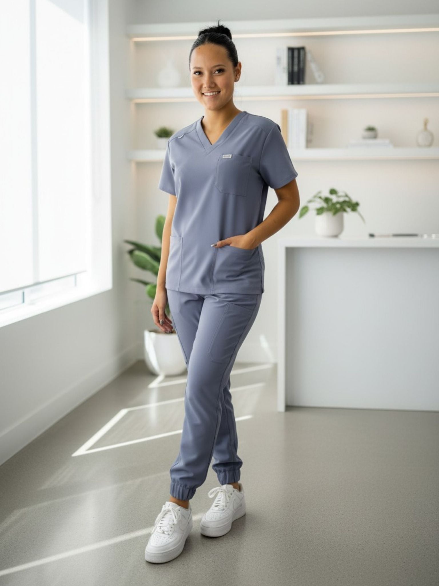 Women’s Twilight Sky Blue Scrub Set with Joggers – 3 Pocket Top & 10 Pocket Joggers Eco-Friendly Fabric Flattering Uniform