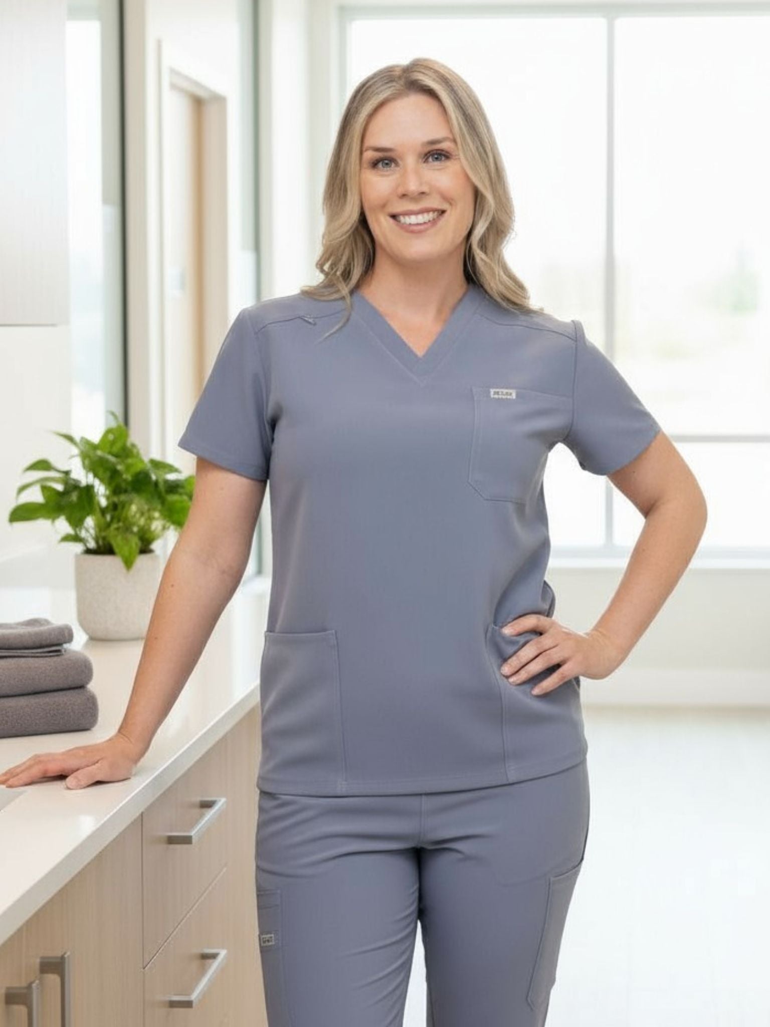 The IRONIK Twilight Sky Blue Scrub Set pairs our 3-pocket v-neck top with 10-pocket jogger pants in a striking shade that radiates confidence and calm. This refreshing color is clean and professional — perfect for healthcare, dental, or spa environments that embrace modern style and functionality.